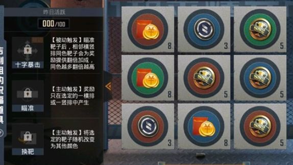 1.十字暴击:瞄准靶子后,相邻横竖排同色靶子会为奖励提供翻倍加成,同色越多翻倍越高