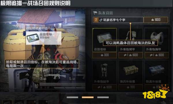 召回信标属于中高级资源,稀有度较高,拾取之后可以将淘汰的队友召回,队友可以在一定时间之后重新跳伞进入战场,但是每个人只能使用一次。此道具类似火力对决2.0中的复活卡,但召回信标可以随地使用,不需要找专门的信号塔或者特殊位置。建议你找一个合理的地方召回队友,避免队友复活之后刚落地就再次成盒。
