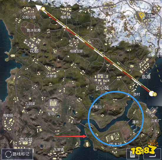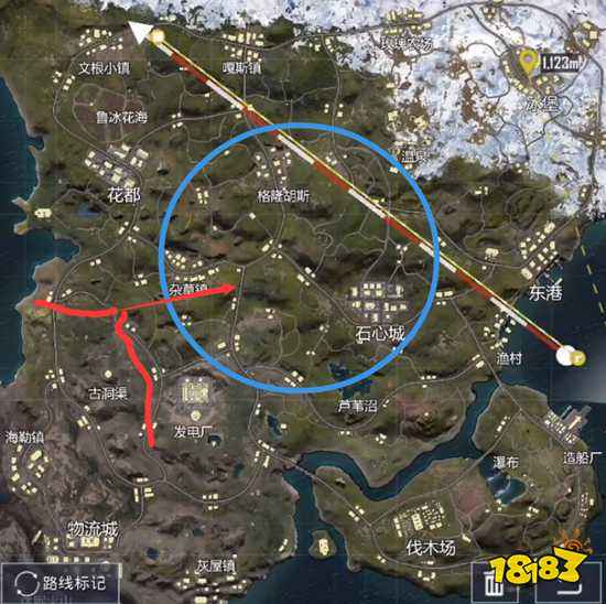 如果我们遇到了同心圆这种圈,也就是中心圈,那么我们可以选择一个后方大资源点较少且周围山坡比较多的地方进圈,例如上图红色箭头的位置,我们的后面是一片野区,相对来说遇到敌人的概率也不会那么大,即便遇到敌人也都是从野区来的,和去城区钢枪出来的敌人不同,许多打野的敌人都是技术不是特别强的,和去城区钢枪的敌人之间,还是有一些差距的,我们打起来也是比较轻松的。