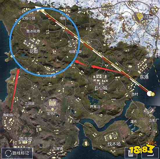 当我们在山谷这张地图中,遇到边角的刷圈,那么我们可以采用两条路线进圈,第一种路线就是沿着海边走,等我们到达海边并进圈之后,可以在海边的边缘位置架枪,对于这种左上角的圈,首先的战争爆发点就是花都这里,而我们的位置在花都的后面,前面是小路+平地,如果有敌人过来我们第一时间就能发现,后面也是平地,有敌人来我们同样可以发现,转移时,也可以从圈边走,卡着圈边进圈。