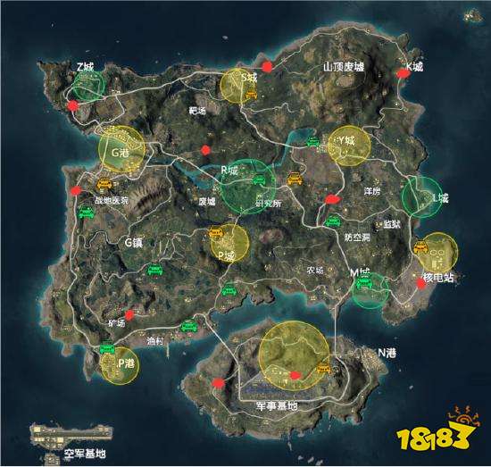海岛地图上总共有十个刷新位置,分别是Z城、S城、K城、水城桥北部、矿场、核电站、G港下城区公路、Y城麦田南侧公路军事基地西面野区跟军事基地内部。