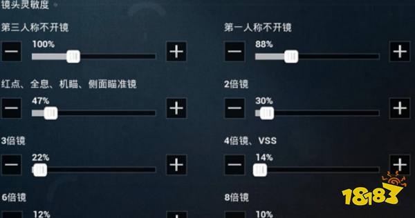3、镜头灵敏度:第三人称不开镜100%;第一人称不开镜88%;红点、全息、机瞄、侧面瞄准镜47%;2倍镜30%;3倍镜22%;4倍镜、VSS14%;6倍镜12%;8倍镜10%。
