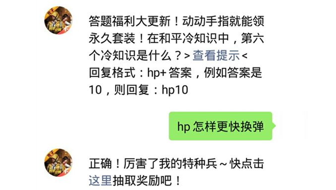 答题福利大更新!动动手指就能领永久套装!在和平冷知识中,第六个冷知识是什么?>查看提示<