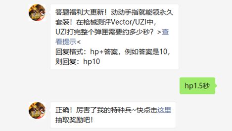 答题福利大更新!动动手指就能领永久套装!在枪械测评Vector/UZI中,UZI打完整个弹匣需要约多少秒?>查看提示<