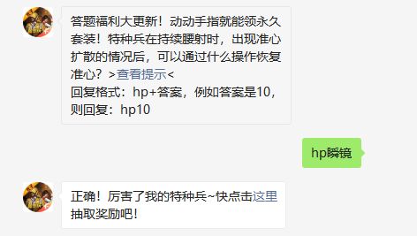 答题福利大更新!动动手指就能领永久套装!特种兵在持续腰射时,出现准心扩散的情况后,可以通过什么操作恢复准心?>查看提示<