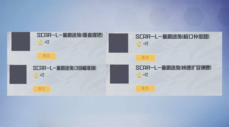 特效枪自然少不了配件皮肤,童趣迷兔与梦幻火箭一样,配件中仍然没有轻型握把、6倍镜的皮肤,这也说明光子仍然没有对这方面的皮肤进行优化,不过在游戏内装配这些没有皮肤的配件后还是相当影响美观的!