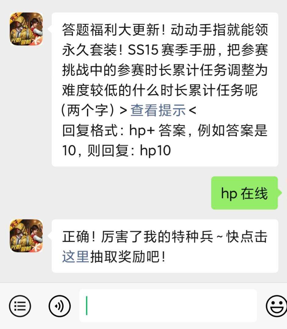 SS15赛季手册,把参赛挑战中的参赛时长累计任务调整为难度较低的什么时长累计任务呢?应该有很多小伙伴不知道这个问题的答案。今天小编就为大家带来和平精英9月15日微信问答每日一题的答案。