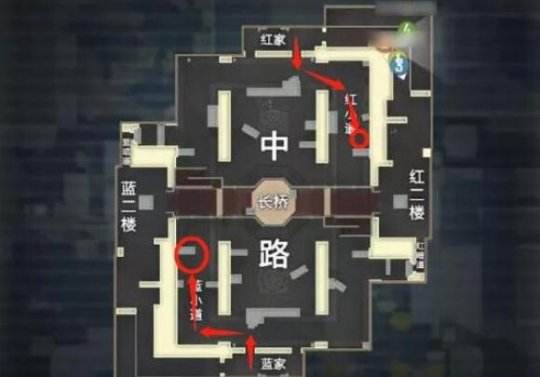 在路线选择方面,小编建议小伙伴们开局从一楼的拱门出发,或者是从一楼绕到敌方暗道。从拱门出发的话,可以卡在小道中段的书桌后面,这个位置可以获得不错的第三人称视野,再加上掩体多,截住从另一方小道或中路进攻的敌人,应该不是问题;另一条路线可以出其不意地打伏击,这个点位屡试不爽。我们绕到敌方暗道之后,在斜坡位置面向敌方二楼返场点趴下,静候对方的到来。