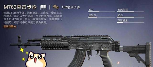 m762子弹单发45伤害,比 ak47少2点,比m416多5点,射速比ak快很多,和416差不多,同时开枪,m762比 m416和ak47更容易让敌人先倒地。但是它垂直后坐力很大,裸枪没配件很难掌控。