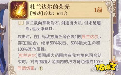 【被动】 攻击时,在目标敌方角色旁召唤1把【杜兰达尔】,存在1回合,继承50%攻击、50%最大生命和100%其他属性。圣剑出现时,以神圣的光辉号召队友,勇敢地发动冲锋,使所有我方角色向目标全速移动。