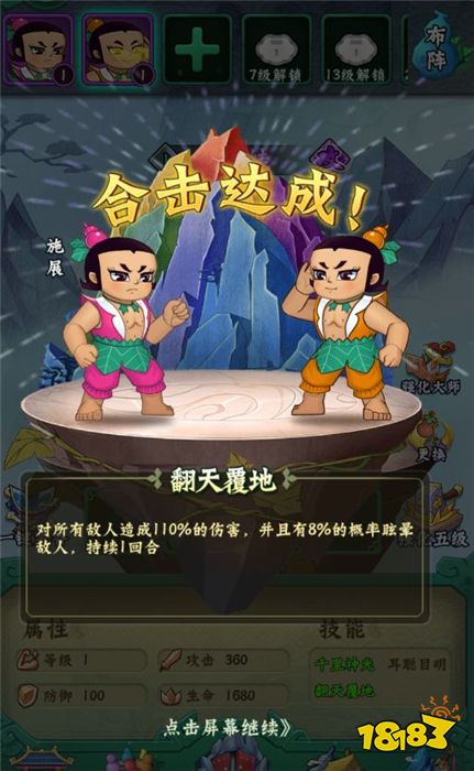 这是一款放置类的回合制游戏,比较休闲,不氪金也可以玩,还是很推荐尝试的~游戏的剧情也是根据电影剧情来的,在游戏的开场,我们会受教程指引种下葫芦,然后爷爷就被抓走了,这时候点击大娃就会落地,然后就去挑战妖怪救爷爷了。