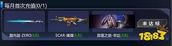 活动内容:玩家充值任意金额即可获得激光剑-ZERO(5天)、SCAR-璀璨(5天)、放逐之剑-辛达(5天)豪华组合礼包