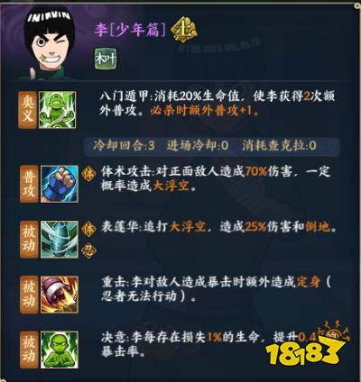 以上就是18183小编给大家带来的火影忍者OL手游李【少年篇】的综合属性介绍,希望大家都能很快熟练的运用李【少年篇】哦。