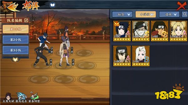 阿斯玛一号位、佐助二号位、主角三号位、勘九郎四号位。(站位三主通用)