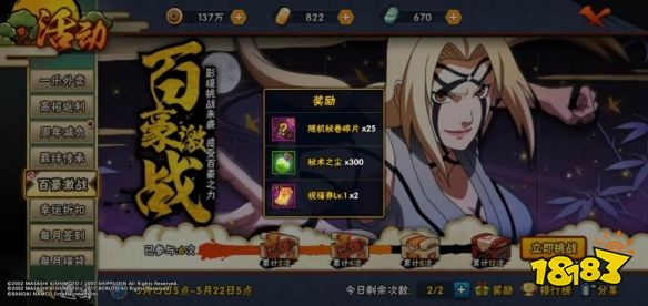 在百豪激战活动中,玩家将面对强敌纲手【百豪】。在此形态下,她的力量与再生能力都获得了极大的提升。面对这名具有影级实力的忍者,获得胜利将不再容易。