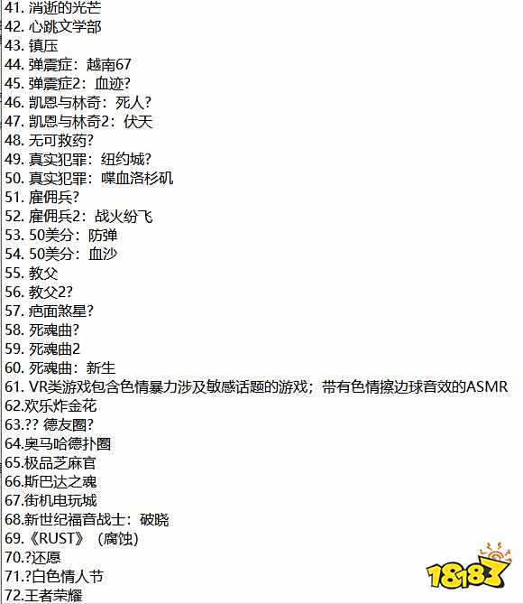 以下为游戏直播禁播名单,名单内游戏内容不允许在平台内直播,直播以下游戏内容的主播,平台有权对账号进行断播或封号等处理: