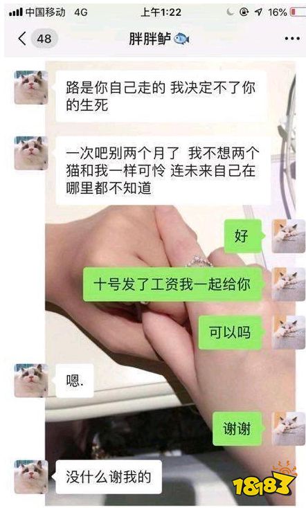 之后又是一段女友要钱的聊天记录,女友表示不希望两只猫和自己一样可怜,Lies表示十号发了工资后一起给你。