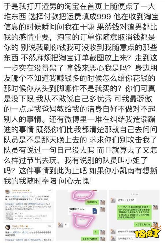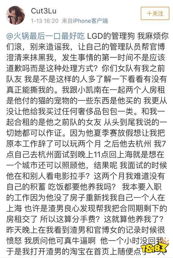 不过Lies女友看到了这篇反转文之后再次回应:这是LGD的管理层故意造谣自己,出了事情不去道歉,而是抹黑别人。这六万块是自己租的房子因为Lies不能租了,所以他帮忙付了剩下的房租,这不算分手费,这也不算是他在养我,而且自己盗刷他的银行卡是因为自己发消息,他不回,在淘宝上乱下单后他才回了自己,而且淘宝订单是可以随意取消的,钱一直都在他那里,自己从头到脚没有一件东西是他买的。