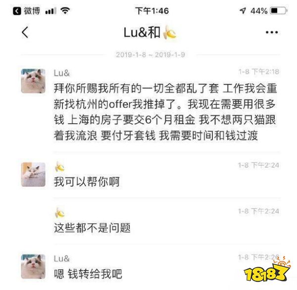 首先Lies这边公布了一段1月8日和女友的聊天记录,可以看到女友表示自己现在的生活乱了套,工作要重新找,还要交6个月的租金,自己还带着两只猫,需要时间和钱过渡,Lies表示自己可以帮你,这些不是问题。于是女友回复:钱转给我吧。
