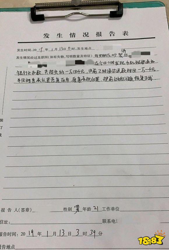 之后Lies在13日凌晨报了警,并且根据他的描述:自己因为和女友吵架,在13日0时发现手机短信通知银行卡扣款了1万四千元,目前通过退款找回了一万一千元,并且女友也承认自己是恶意的,愿意承担后果,只是为了报复自己。