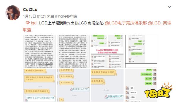 1月13日凌晨,在距离LPL春季赛开赛前一天,LGD的新人上单Lies的女友在微博上控诉自己被绿了,而且Lies的出轨对象还是LGD的官博悠悠,并且发布了大量的聊天记录证实,至少Lies在和女友交往期间喜欢上了悠悠是实情,出轨基本坐实。而且在Lies和女友的聊天记录中,Lies也威胁女友:大不了同归于尽!于是1月13日下午,就有人爆出了Lies的一些相关消息,表示其实是女友索要分手费,才故意抹黑Lies,现在Lies已经报警立案了。