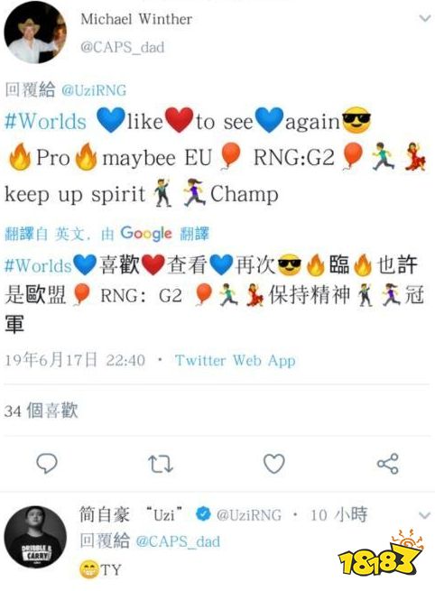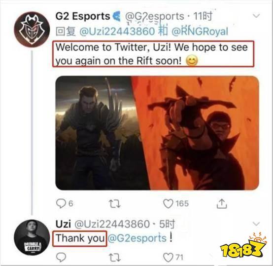 其实UZI在推特上互动的人还是挺多的,除了Caps爸爸之前,就连争议比较大的G2俱乐部都互动过。在UZI开了推特的第一天,G2战队就赶来表示:欢迎UZI来推特,我们希望再次在世界赛上见到你!当时UZI也是回应了:谢谢!