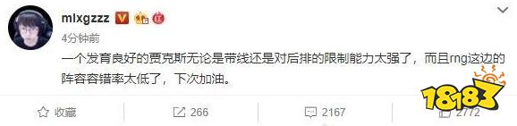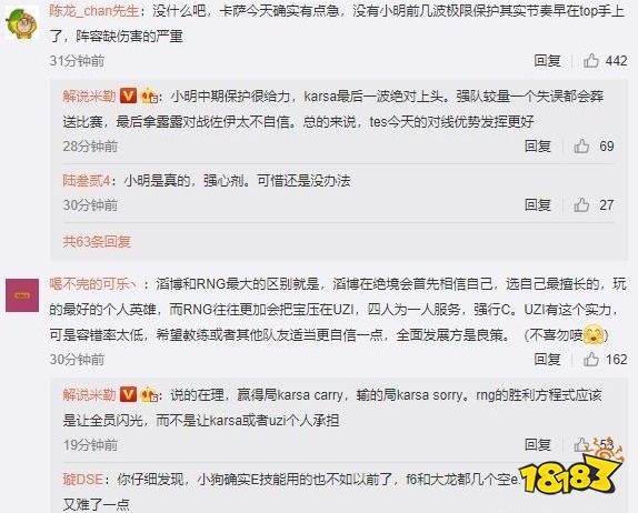 同时在评论区,米勒也继续表示:karsa最后一波绝对是上头了,强队之间的较量就是任何一个失误都不行,小虎拿露露打佐伊还是对自己不够自信,现在RNG赢得局karsa很carry,输的局Karsa很sorry,RNG应该尝试让全员闪光而不是让karsa或者UZI个人来承担。