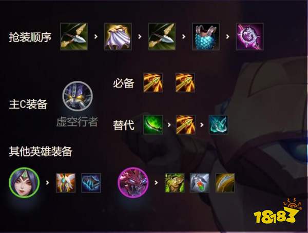 主C虚空行者(卡萨丁)装备给上分裂弓,分裂弓必备可替换降星刀龙爪反甲。