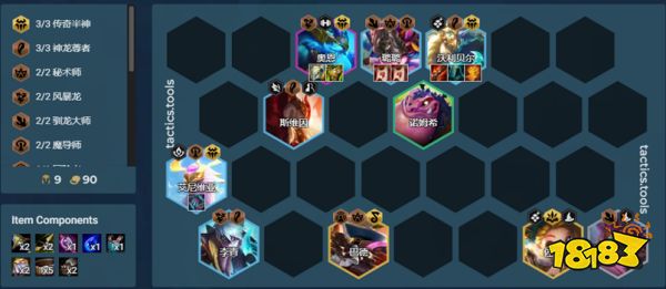 新前版本最爽套路之一,比时空裂痕的拉面熊还要变态!阵容的思路是半神狗熊可以获得邻格友军单位的100%生命值、护甲和魔法抗性,外加这名友军的40%法术强度。而驯龙大师的召唤物:蛤蟆(我也不知道为什么驯龙大师召唤的是魔沼蛙)自带养成属性,可以提供巨额的双抗和血量,是献祭的完美人选。两者结合的狗熊又肉又有非常爆炸的输出,玩起来非常快乐强度也很高!