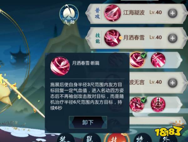 月洒断篇:自身半径3尺队友恢复气血,招式结束后进去名动四方姿态(浮空),持续6秒为6尺附近队友随机治疗。