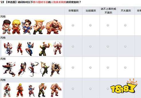 问卷中,询问了玩家对于《街霸》IP的体验情况,还列出了四种不同的格斗题材手游的人物美术风格,让玩家选择自己喜欢的风格。