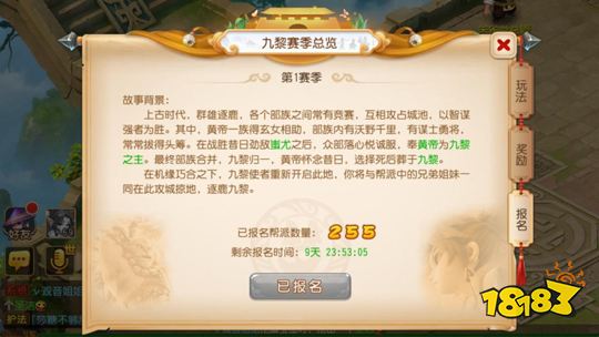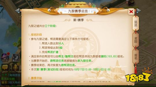 本赛季的报名阶段为10月17日12:00至10月31日12:00,满足条件的帮派在完成“九黎往事”解锁任务后,可由帮主或副帮主前往九黎使者哪吒处报名。赛季开始后,原帮派任务将被替换成新九黎任务,赛季结束后恢复。