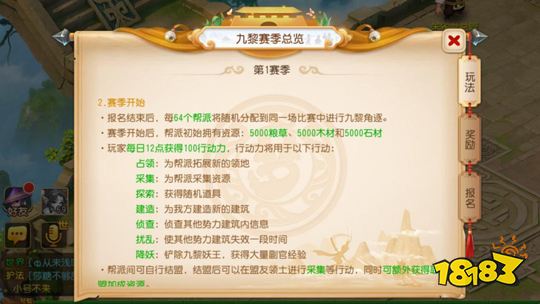 赛季开始后,每64个帮派将随机分配到同一比赛中进行九黎角逐。帮派初始拥有粮草、木材、石材资源各5000,玩家每日可获得100行动力,用于占领、采集、探索、建造、侦查、扰乱和降妖。同时,帮派间可自行结盟,结盟后可在盟友领土进行采集等行动,以获得额外资源。