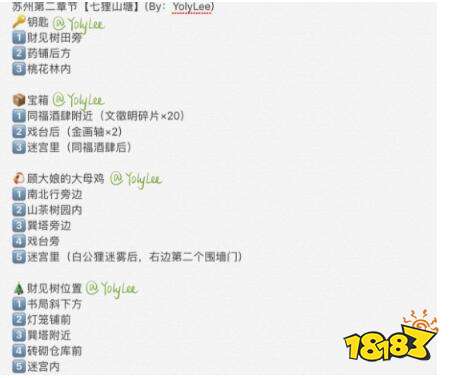 宝箱如图:鸡(五只):1-南北行右边 ;2-巽塔后面 3-啊意杂货铺(灯笼店)旁边山茶树丛 4-迷宫右下(点击门即可驱散迷雾) 5-戏院旁边