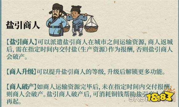 商人出现方式一是类似西域商贾,严大人的出现方式,头上顶个牌牌城里到处走,二是类似码头有个专门的盐引商人建筑,点建筑交易,个人倾向到处走,交易方式类似码头货船,固定刷新时限,点开界面选择资源,自动运输贩卖,到点收钱,