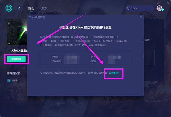 第四步:使用Xbox主机,打开网络连接设置,根据UU加速器中给出的网络参数进行连接。