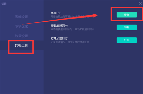 第一步:打开UU加速器,并打开加速器设置,在加速器设置中点击进入【网络工具】专栏,可以看到【修复LSP】功能,点击就能一键检测并修复玩家网络异常。