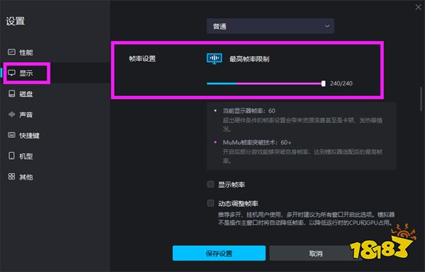 第三步:点击右上角的“三个横线”按钮,进入模拟器设置中心,在【显示】设置中,将【最高帧率限制】提升到240帧。