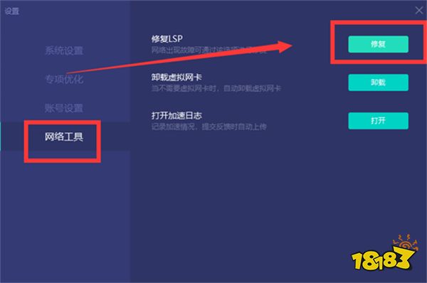 启动UU加速器,并开启加速器设置窗口,UU加速器设置中,配备有【网络工具】专栏,点击网络工具中的【修复LSP】就可以一键进行网络异常检测和修复了。