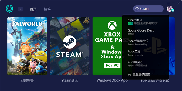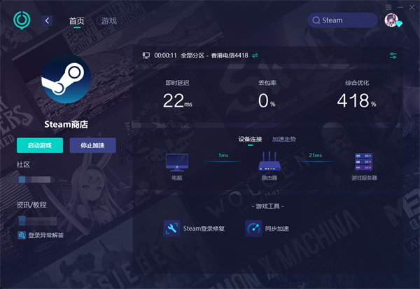 第二步:在加速器搜索栏中,输入【Steam】,就可以看到【Steam商店】游戏加速了,点击即可一键开始加速。