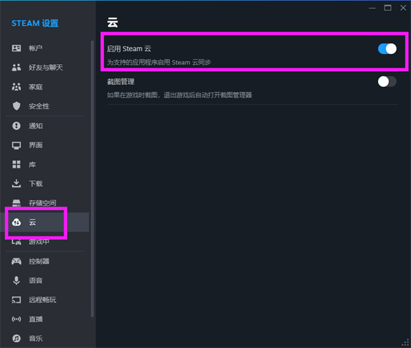 第五步:在Steam设置面板中,选择【云】,开启【启用Steam云】开关。