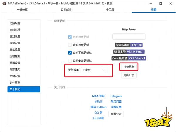 第五步:启动MAA小助手,在MAA主界面-设置-关于我们,将更新版本改为内测版后,点击检查更新,将MAA版本更新至v5.1.0及以上版本(内测版不够稳定,请持续关注及时更新版本)。