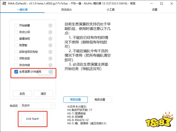 第七步:点击MAA左上角的【一件长草】,勾选【生息演算·沙洲遗闻】,并点击下方的【Link Start】按钮,就可以开始自动通关《沙洲遗闻》生息演算了。