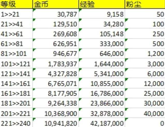 1级升到对应等级的资源总消耗量