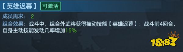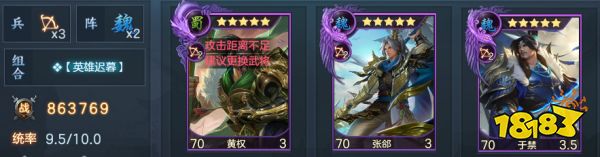 队伍的强度比较一般,但是能把自己身上剩余的武将卡和技能用起来,迟暮组合技可以弥补张郃发动几率不足的缺陷,让张郃的专属技能发动率提升至55%,彻底释放张郃的输出能力。黄权在队伍里要保证敏捷高于张郃,这样每回合都能给张郃提供首攻增伤。
