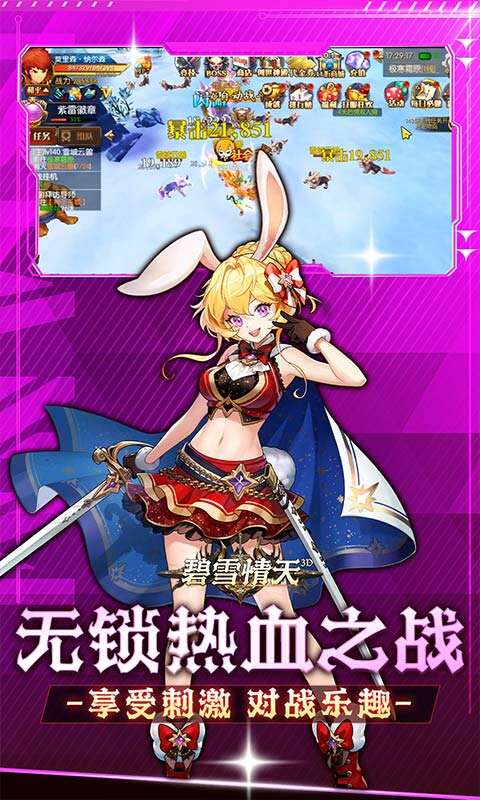 《碧雪情天3D》是一款高操作性MMORPG动作手游! 游戏内永久每日免费送1000元无门槛代金券! 游戏原创独特画风,别具一格视觉体验,创新战斗连招快感,前所未有视觉冲击,无锁热血之战,享受刺激对战乐趣!恶龙即将觉醒,化身真正的勇士,守护勇者大陆最后的光明!