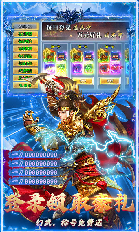 1、创角即送自动拾取,自动回收,一亿切割。 2、AI助手:免费激活御剑术、神装、百万元宝。 3、天天送代币:每日登录领648代币 。 4、VIP福利:每日击杀怪物送超级VIP卡。 5、免费时装:完成大陆目标免费领取。 6、签到礼包:登录就送幻武、称号、充值卡。 7、活动玩法:参与活动玩法更有材料、装备、大量充值卡获取。