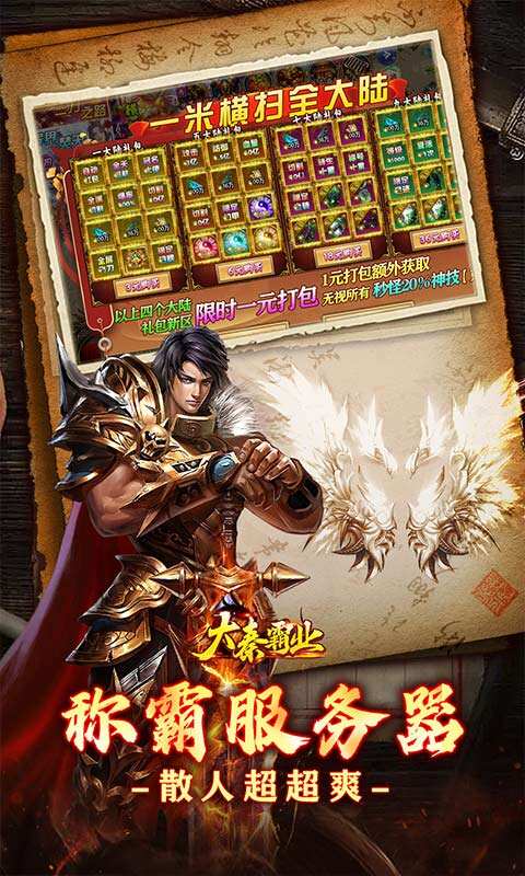 1、打怪就给礼包币!礼包币=所有大陆礼包! 2、千种隐藏BUFF+武学+幻化+英魂+超多好玩玩法等你探索! 3、上线就送免费狂龙,免费仙尊,免费神霄,免费魔渊,免费礼包! 4、本服特色:不卡大陆-毫无套路-时间=称霸服务器! 5、千种装备万种地图,超变玩的就是爽爽爽爽爽!!
