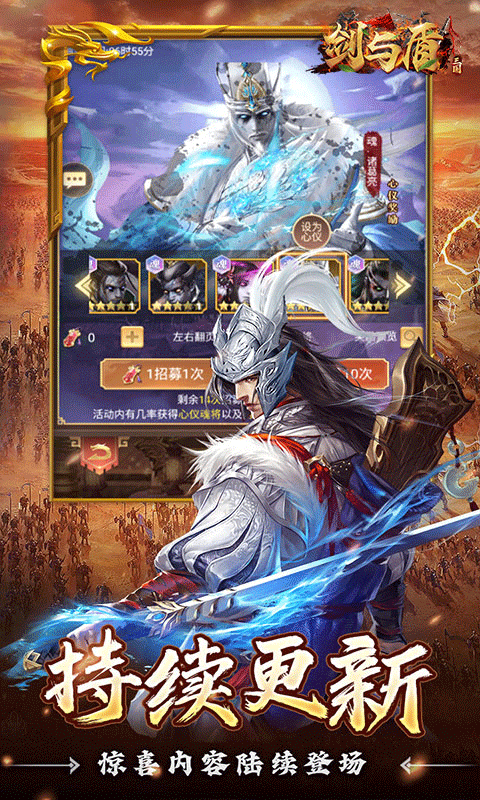 放置三国卡牌手游《剑与盾》0.1折热血来袭!充值永久0.1折,1分钱也能当大佬!享受千抽豪礼,搭配海量真充卡,武将、元宝拿到手软,强力阵容轻松成型!你可以集结关羽、吕布、张辽等传奇名将,自由搭配战术组合!装备加成、羁绊联动,每一场战斗都是智谋的较量!全武将星级无损重置,随时调整阵容,告别资源浪费!九天神将回人间,幽冥魔兵席卷来,《剑与盾》等你来战!