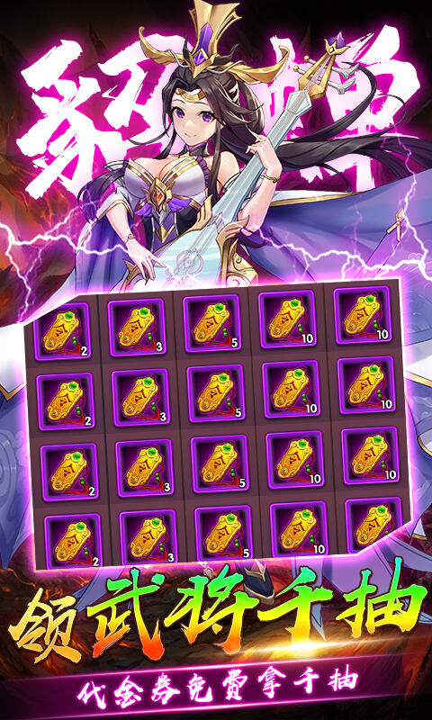 1、全场充值首续0.1折,充值比例1:50,全场常规物价,首充多倍!海量元宝拿个够! 2、一键自动闯关解放你的双手不肝不氪制霸三国! 3、登录拿极品武将,在线登录拿海量资源 4、在线完成任务拿海量代金券,免费玩游戏!